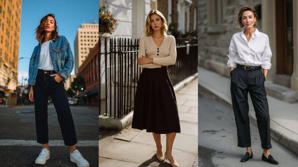 Every single outfit in this guide can be built from a core set of carefully chosen foundation pieces. Once you have these in your wardrobe, the outfit combinations become almost endless. Here are the pieces that appear most frequently across all 55 looks:
